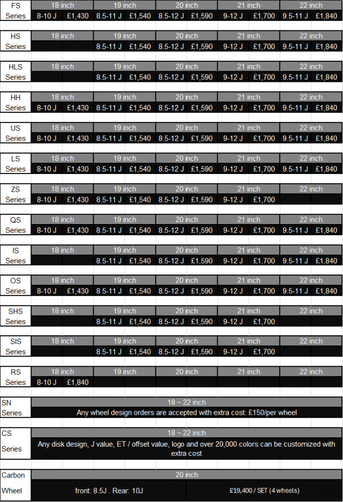 | 12. Any customised design accepted outer-ring design at an extra £50/per wheel. | |